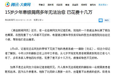 《15岁少年患银屑病多年无法治愈 已花费十几万》报道