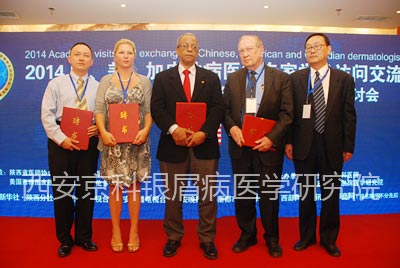 为了更好的促进中西方皮肤病医学技术交流合作,西安莲湖京科医院也向美国及加拿大来访医生团顾问颁发聘书,并签订学术研究成果使用授权书,同时美国、加拿大引入我国“3D净血疗法”,美国华盛顿大学医学院皮肤科主任、美国西雅图皮肤中心创始人、世界308之父伯纳德·葛菲教授(Dr.Bernard S.Goffe,MD,FAAD)表示“3D净血疗法”结合中西医精髓,从致病根源血液着手,疗效彻底,治标治本。