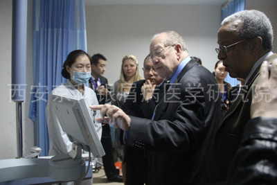 在医护人员的陪同下,伯纳德·葛菲教授、宋建明博士、巴里·皮特博士、崔西·奥多维彻女士等美加医生先后参观了医院的化验室、诊疗室及医生接诊室,医护人员也向参会的美加医生介绍了各种治疗银屑病的特色中医疗法。作为308准分子治疗方法的发明人,伯纳德·葛菲教授在参观过程中,还就该院308准分子在临床诊疗中的应用进行了指导,同时还对西安莲湖京科医院的3D净血疗法、中医诊疗体系、308nm准分子激光治疗体系等先进的诊疗技术产生了深厚的兴趣。