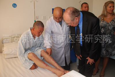 随后伯纳德·葛菲教授、巴里·皮特博士及宋建明博士等人来到三楼住院部,对患者进行联合会诊。在得知各几位重症银屑病患者,通过医院参与研发的3D净血疗法治疗,病情都出现了不同程度的好转,伯纳德·葛菲教授对西安莲湖京科医院在临床上卓越的疗效和创新的理念感到惊叹。